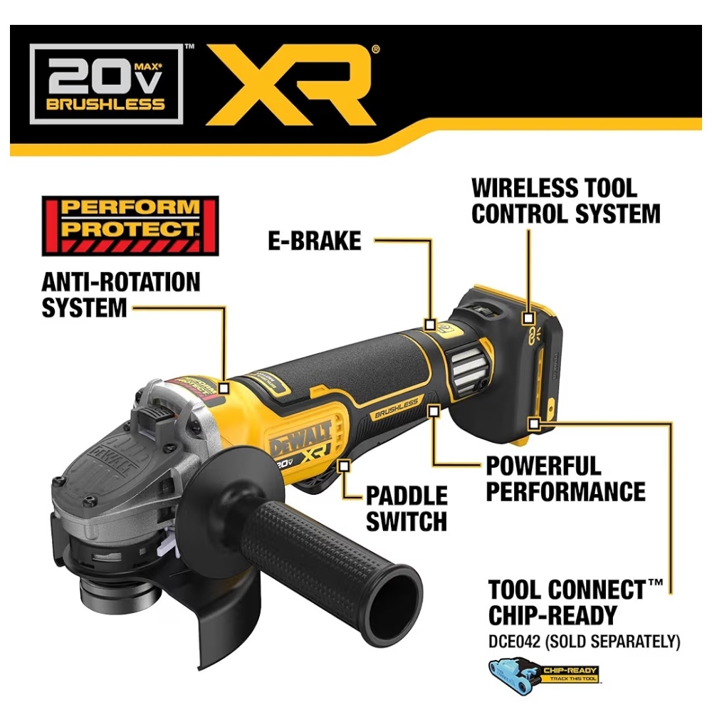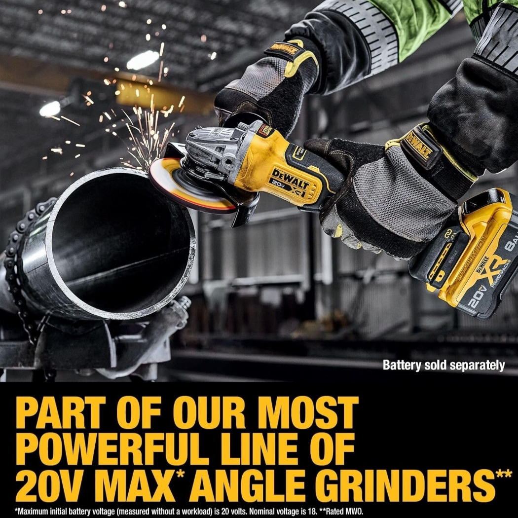 DEWALT DCG410VSB Parte de nuestra línea más potente de amoladoras angulares de 20V,Optimice el control del usuario: ayude a garantizar un rendimiento óptimo en una variedad de materiales con funcionalidad de velocidad variable que permite al usuario ajustar la velocidad de la rueda. Rendimiento potente: enfréntate a trabajos difíciles con un motor sin escobillas que ofrece hasta 1.640 MWO y 9.000 RPM (sin carga).Ayude a maximizar el control equipado con el sistema antirrotación que detecta el movimiento de rotación de la herramienta y lo apaga si el movimiento es excesivo.Simplifique la administración de activos: .Sistema de control inalámbrico de herramientas: utiliza el sistema de control de herramientas inalámbrico con capacidad de encendido/apagado cuando se empareja con un extractor de polvo DEWALT compatible (se vende por separado).Parte de nuestra línea de mejores prestaciones de 20V Max* herramientas eléctricas innovadoras diseñadas para ofrecer certeza a los profesionales más duros del mundo.